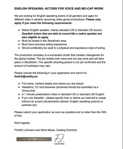 Läs mer!Casting – English Speaking Actors Here is a casting from our good friends and casting directors Fredrik Lehmann and Stina Meyer. Fredrik teaches casting in our one year film acting program. Don’t contact us for more information and send the application as soon as possible to fredrik@castby.se. På gång hos oss Information från oss…